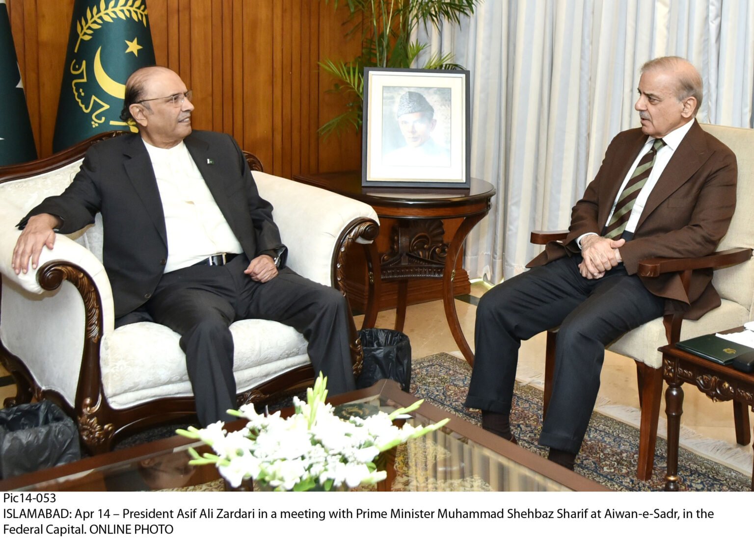 Pic14-053 ISLAMABAD: Apr 14 – President Asif Ali Zardari in a meeting with Prime Minister Muhammad Shehbaz Sharif at Aiwan-e-Sadr, in the Federal Capital. ONLINE PHOTO